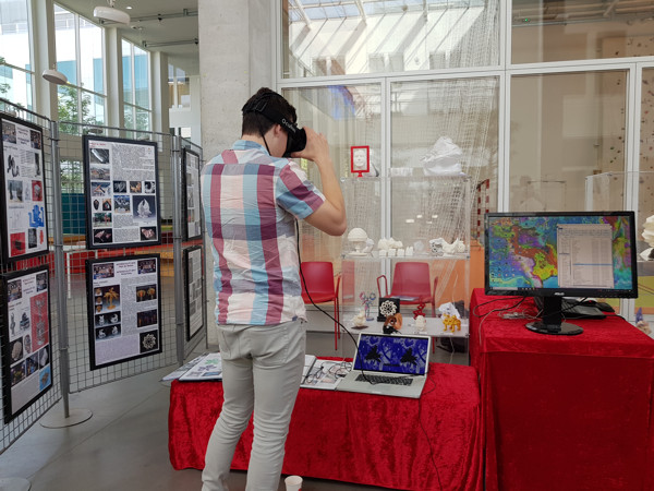 | Un visiteur regarde nos animations 3D stéréoscopiques, avec le casque Oculus | ![]() photo James HUTCHINSON |