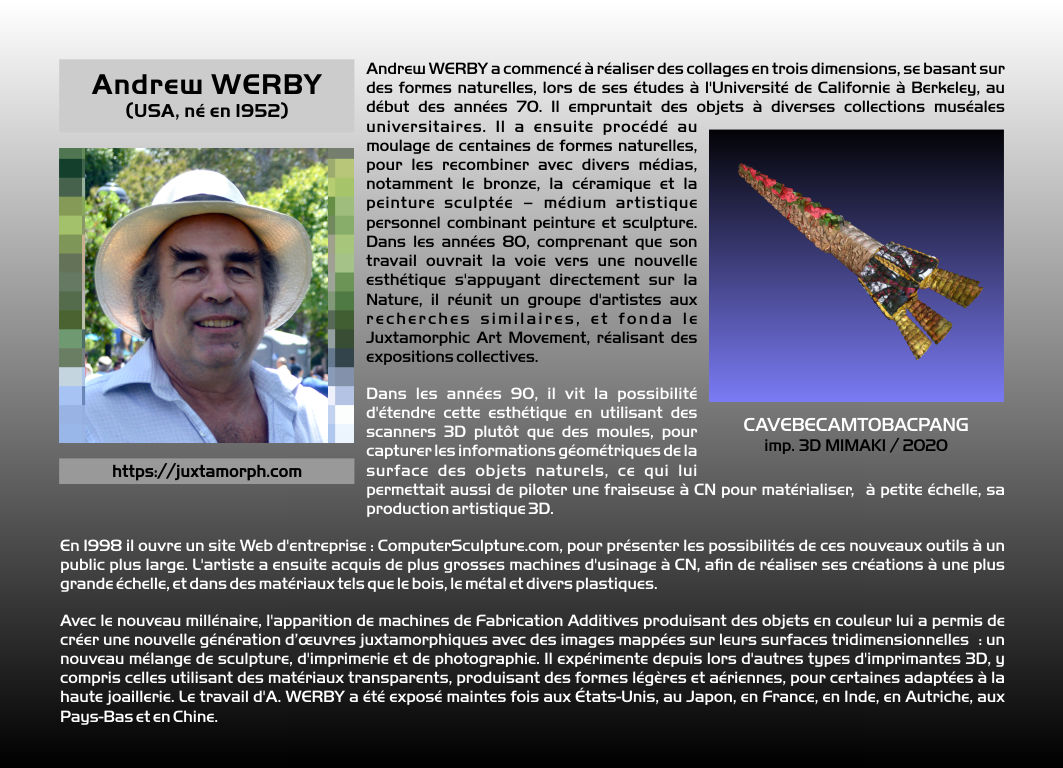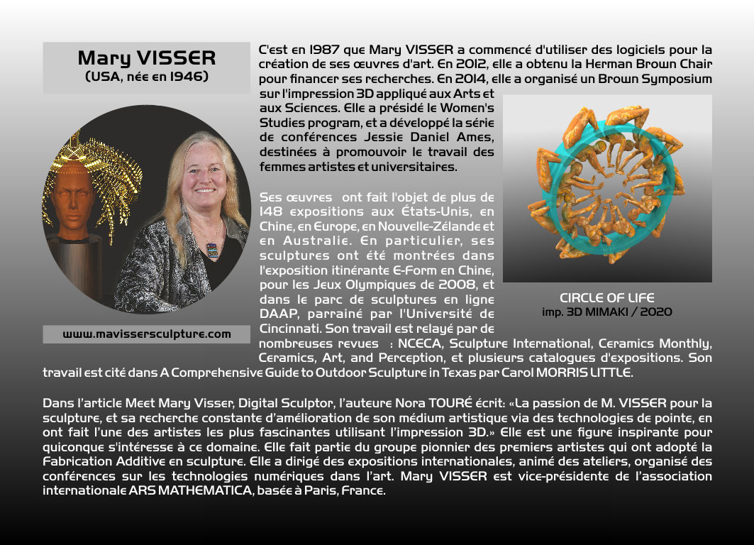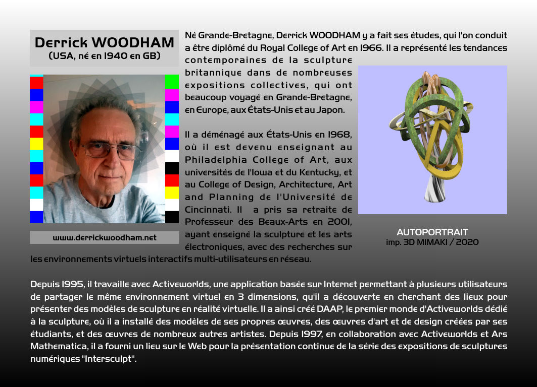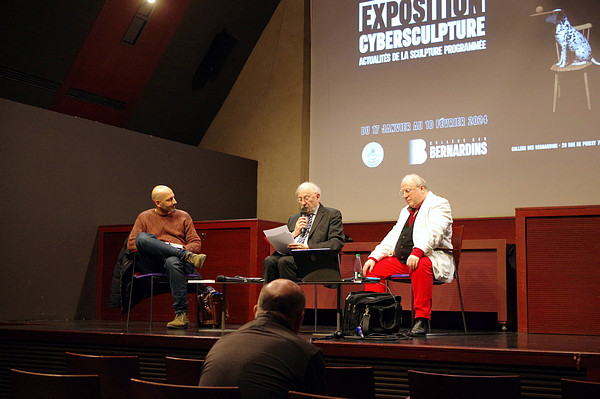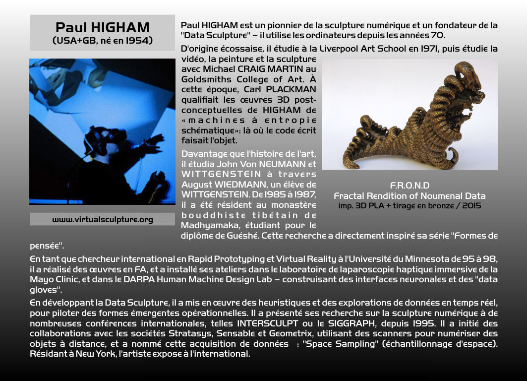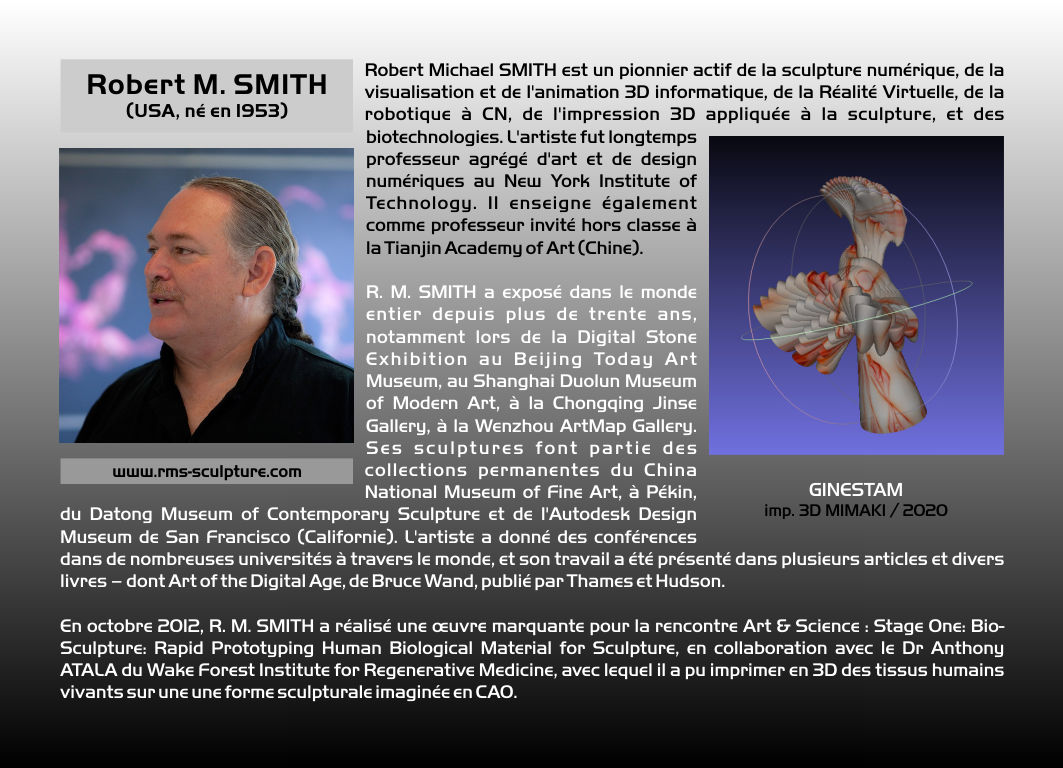 Indépendamment, l'expression SCULPTURE ASSISTÉE PAR ORDINATEUR est proposée par Pierre Bézier dans les années 1970. L'appellation actuelle de notre discipline est SCULPTURE NUMÉRIQUE dans les pays francophones, et, généralement, DIGITAL SCULPTURE dans les pays anglophones. Le terme générique de CYBERSCULPTURE a été proposé en 1995 par Christian Lavigne. Il s'agit de désigner toute forme de sculpture programmée, que ce soit d'une manière analogique ou d'une manière numérique. On peut donc faire remonter ce principe au moins au XVIIe siècle européen, avec l'usage des tours à figures, dont les mouvements excentriques était dus à des sortes de cames appelées rosettes. La sculpture numérique est ainsi un cas particulier de la cybersculpture, une démarche ancienne profondément renouvelée à l'ère de l’informatique et de la robotique. La sculpture numérique désigne trois activités différentes et complémentaires : La création et la visualisation sur ordinateur de formes en 3 dimensions (ou plus) – potentiellement diffusées ensuite via Internet. La numérisation d'objets réels, et leur éventuelle modification pour servir à un projet artistique. La production physique d'objets à partir de fichiers 3D, par des robots: soit par enlèvement (Fabrication Soustractive, tel l'usinage à commande numérique), soit par ajout de matière (Fabrication Additive, telle l'Impression 3D) . La SCULPTURE NUMÉRIQUE prend aussi le nom de ROBOSCULPTURE (Lavigne – 1988), d'INFOSCULPTURE (Vitkine et Coignard – circa 1989), ou de TÉLÉSCULPTURE (Lavigne et Vitkine – 1995) lorsqu'il s'agit de créer dans un lieu, puis de matérialiser dans un autre (première télésculpture transatlantique lors d'INTERSCULPT 1995). Paul Higham a créé la DATASCULPTURE : utilisation de données scientifiques comme paramètres définissant un objet numérique. Naguère, on qualifiait de "SCULPTURE VIRTUELLE" une sculpture présentée sous la forme d'une image 3D, localement ou via Internet. Plusieurs "sculptures virtuelles" rassemblées formaient une "GALERIE VIRTUELLE". Mais l'usage du mot "virtuel", abusif et trompeur, est à proscrire. Un PARC DE SCULPTURES NUMÉRIQUES, le DAAP, a été créé par le Pr. Derrick Woodham (USA) depuis 1996 dans ActiveWorlds (métavers). Les collections de sculptures numériques, matérialisées ou non, d'ARS MATHEMATICA et du DAAP sont les plus anciennes et les plus importantes au monde. Environ une centaine d'artistes y sont représentés. |