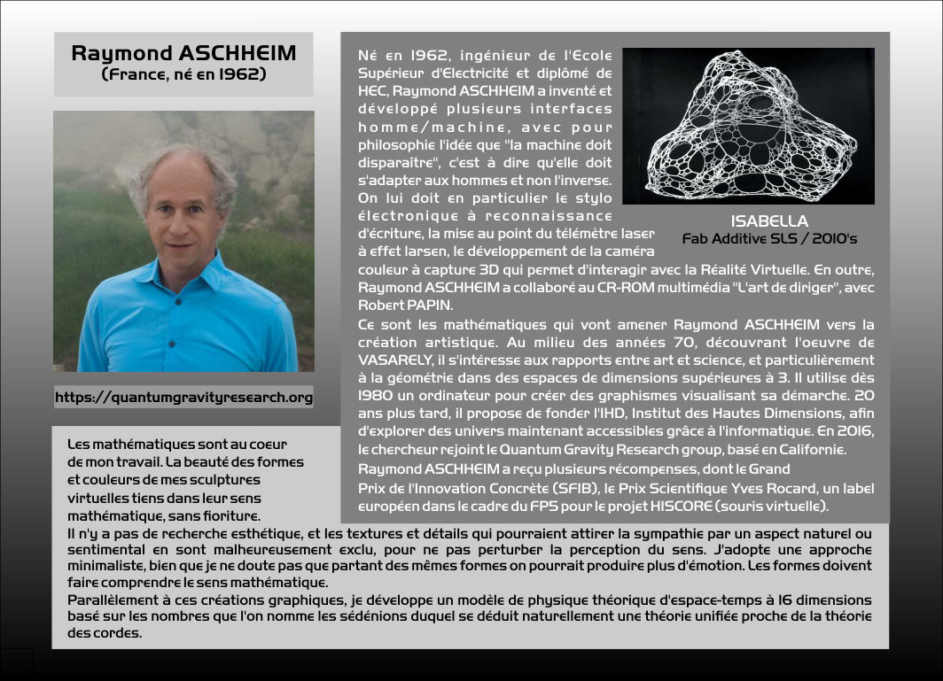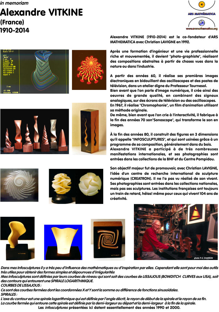 avec notre casque de Réalité Virtuelle. Certaines sculptures numériques des artistes d'Ars Mathematica sont visibles sur ![]() Raymond Aschheim James Hutchinson Valdas Skritas Christian Lavigne Ars Mathematica / Intersculpt |