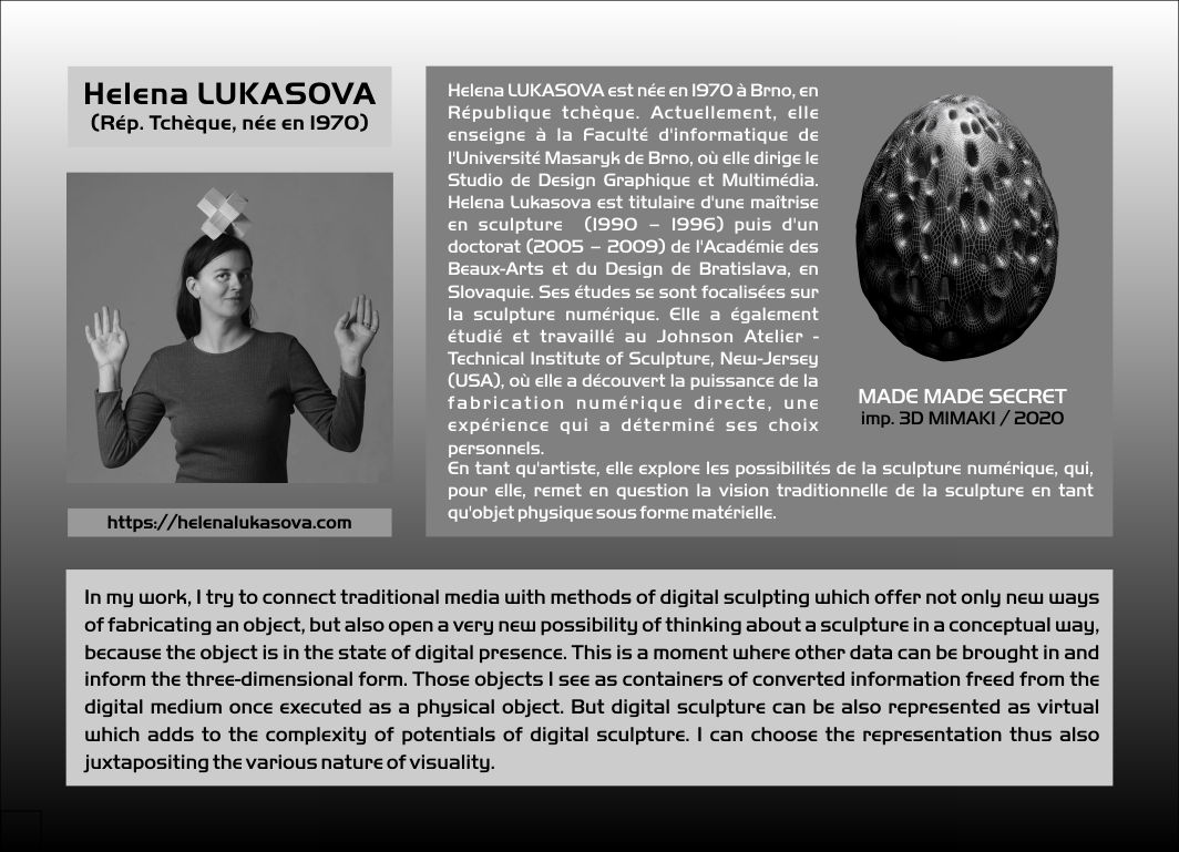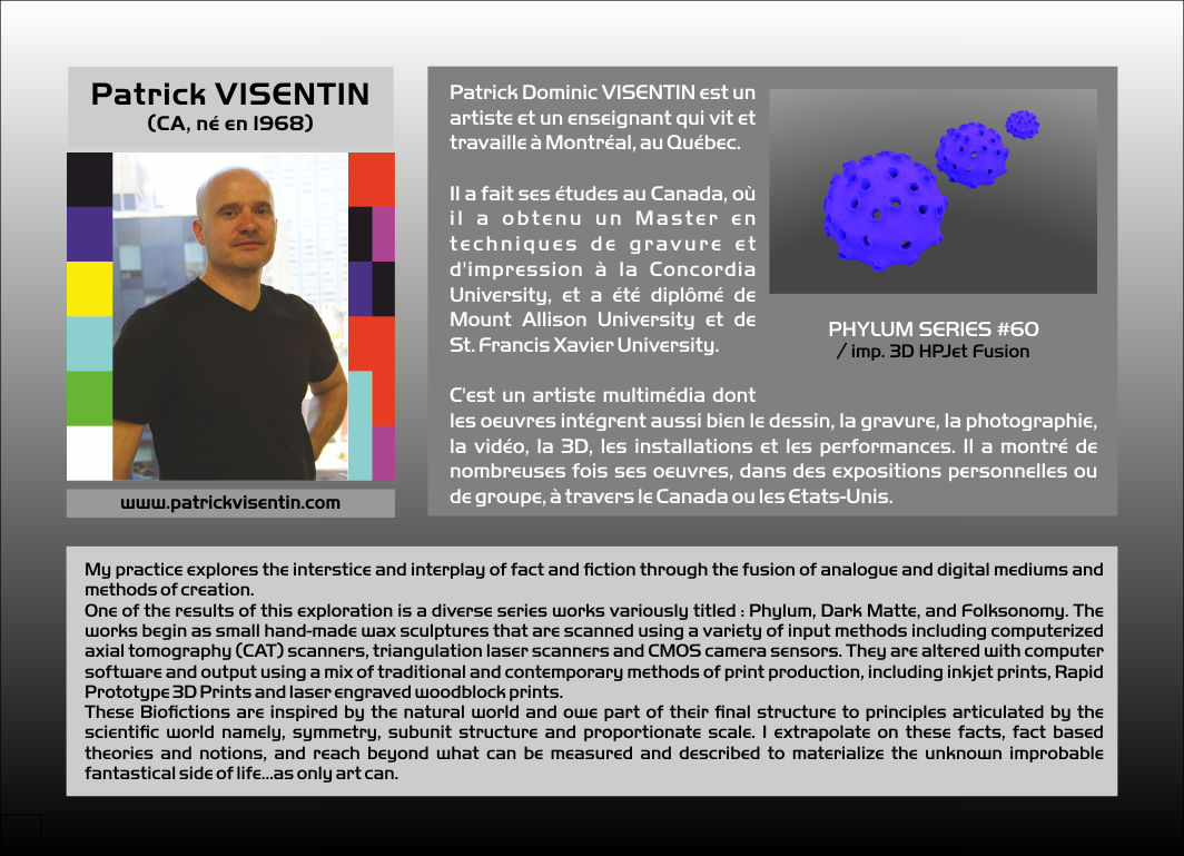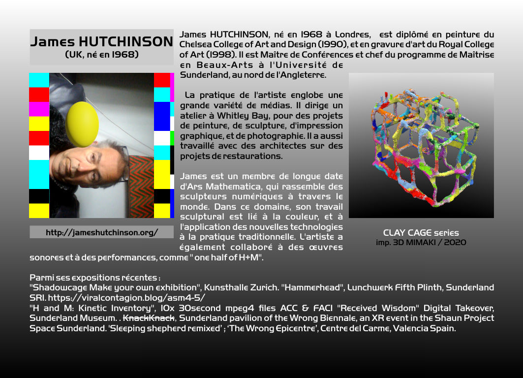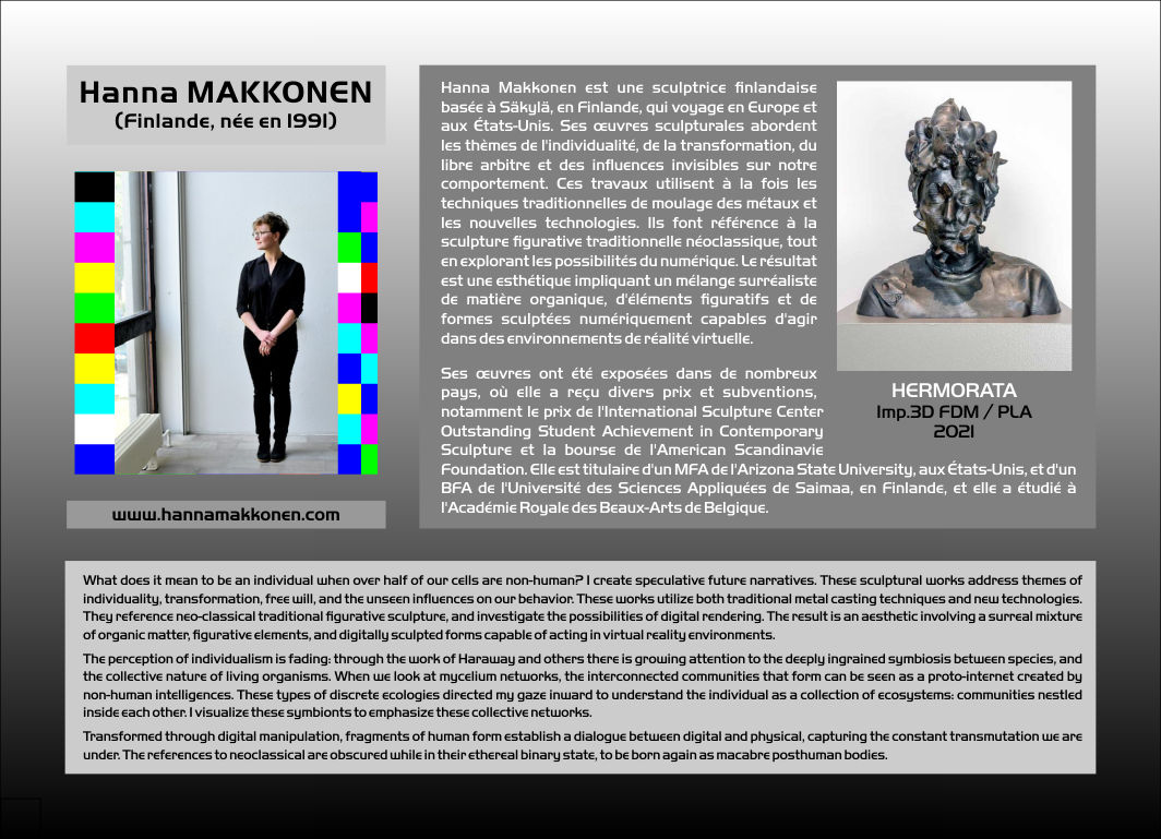 | Artistes présentés: Brit BUNKLEY Paul HIGHAM James HUTCHINSON Christian LAVIGNE Helena LUKASOVA Hanna MAKKONEN Mary NEUBAUER Peter PETERSEN Valdas SKRITAS Robert SMITH David Van NESS Patrick VISENTIN Mary VISSER Jennifer WEILER Andrew WERBY Laura WEST Corinne WHITAKER Derrick WOODHAM Et les cybersculptures historiques de: Jean-Claude ANDRÉ Pierre BÉZIER Jean-Claude CHARPIGNON François WILLEME |