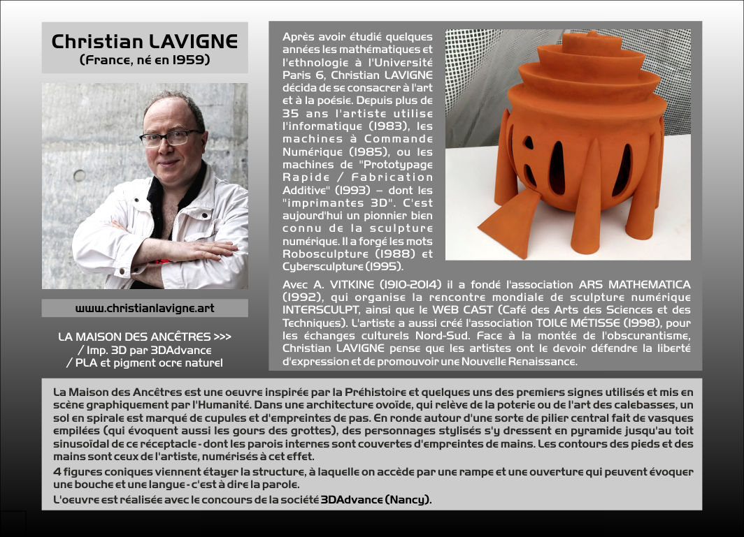 des artistes à l'histoire des inventions. Lorsque le corps ne suffit plus à une volonté d'expression plastique, le pinceau vient prolonger les doigts, l'aérographe ou la bombe de peinture remplace le souffle de la bouche, ciseaux et marteaux viennent tailler des matériaux que ni les dents ni les ongles ne peuvent façonner. Il en va d'ailleurs de même pour d'autres arts, qui, tel la musique, s'adjoignent des instruments. Dans certaines cultures, la machine vient en aide aux artistes, soit pour réduire son effort physique, soit pour aborder ou créer des matières complexes, soit pour lui permettre de travailler à des échelles très différentes de la taille humaine (vers l'immense ou le minuscule), soit pour atteindre une précision difficile voire impossible à maintenir. Enfin, la machine ouvre aussi de nouveaux horizons à l'esprit créatif. La Cybersculpture – ou sculpture programmée ; mot que nous avons forgé en 1995 – offre un exemple parfait de ces interactions fructueuses entre l'art et la technologie. En effet, depuis des millénaires le sculpteur – autrefois souvent associé à l'architecte – doit résoudre des problèmes de changement d'échelle et de matériaux : comment passer du dessin, de la maquette à l’œuvre finale ? La technique de la "Mise aux Points" est connue dès l'Antiquité. Depuis la Renaissance elle a donné lieu à moult inventions, évidemment d'abord avec des procédés analogiques (dont le "pantographe du sculpteur"), puis désormais numériques : telle la Numérisation 3D, qui, associée aux logiciels de Conception Assistée par Ordinateur (CAO), débouche sur la Fabrication Soustractive : découpe, usinage à Commande Numérique (CFAO), ou la Fabrication Additive (dite "Impression 3D"). Toutes ces techniques récentes intéressent aussi bien l'art dit figuratif que l'art dit abstrait. Mais l'ordinateur n'est pas une machine comme les autres, pour la simple raison qu'il n'a pas de fonction propre : tant qu'il n'est pas programmé, il ne sert à rien ! C'est une sorte d' "outil protéiforme" auquel l'artiste – seul, s'il est compétent, ou bien assisté d'un ingénieur –, peut donner un sens, un objectif particulier. Mais autant il n'y a guère de surprise dans notre interaction avec un marteau ou une fraiseuse, autant l'informatique peut nous entraîner vers des formes inconnues, des univers inexplorés. Depuis peu, quelques artistes, dans des domaines variés, s'essayent à l'usage de la prétendue Intelligence Artificielle. La production des artefacts devient alors pléthorique. Si l'artiste, dans son humanité essentielle, ne veille pas à trier le bon grain de l'ivraie, alors cette "fabrication artistique" se perdra dans les marécages de l'insignifiant. Christian LAVIGNE, décembre 2023. |