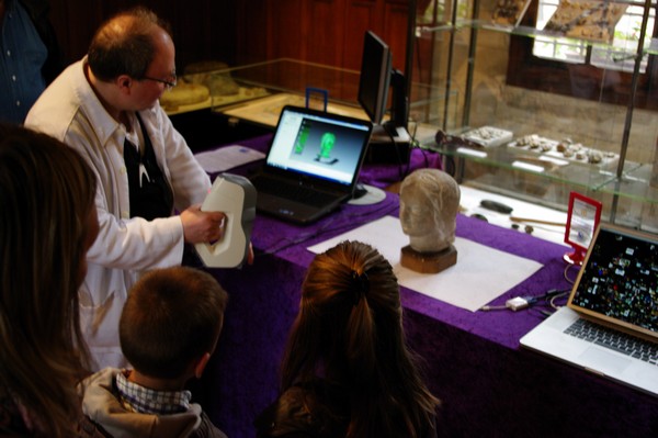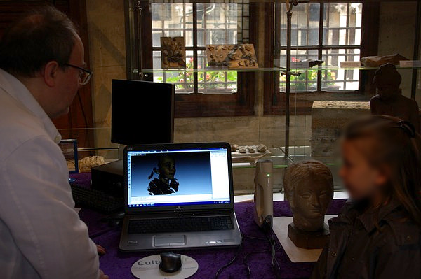 scanner 3D EVA, devant une tête en marbre du XVe siècle (date possible, pièce des réserves du musée) | |