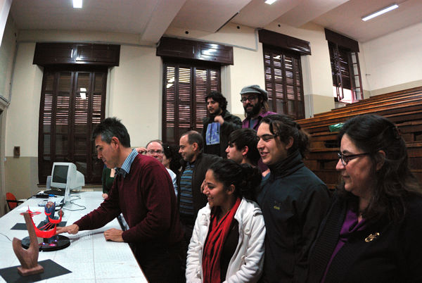 Le Pr. Paola PIU montre comment réaliser des surfaces minimales avec du fil de fer et de l'eau savonneuse. | |