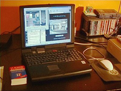 Pendant la nuit, le Coordinateur Général d'INTERSCULPT 2001, Christian LAVIGNE, était en contact avec les autres sites, depuis on domicile. On voit sur son PC à gauche l'image de la SmileCam de Paris et à droite l'image de la webcam de Hong Kong.
