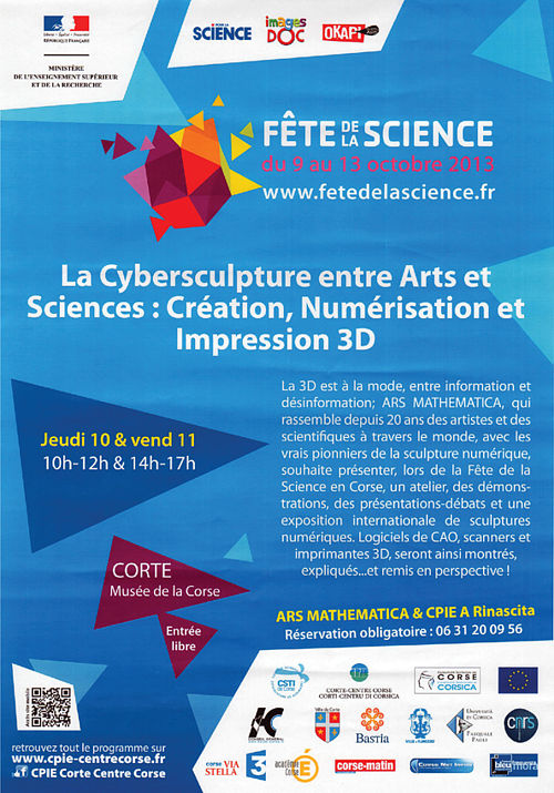 CORTE - Corse / Corsica Fête de la Science 2013 ![]() Jeudi 10 - Vendredi 11 Thursday 10 - Friday 11 Octobre October La Cybersculpture entre Arts et Sciences : Création, Numérisation, et Impression 3D Musée de la Corse Museu di A Corsica 10H -18H 10am - 6pm Manifestation nationale soutenue par le Ministère de l’Enseignement supérieur et de la Recherche, la région Corse (CTC), l’Europe, coordonnée par le Pôle Territorial de Référence de la CSTI en Corse - CPIE Corte Centre-Corse A Rinascita ![]() |
