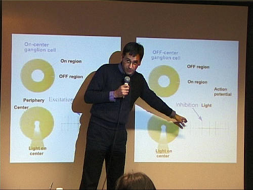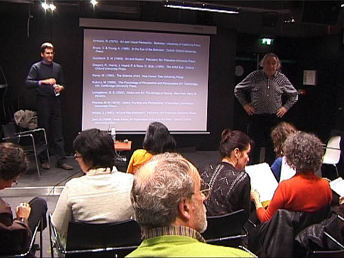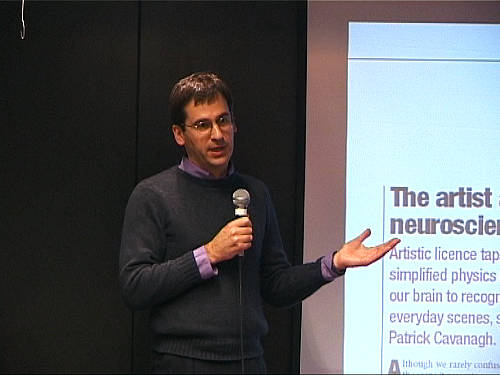 Les artistes visuels ont de tous temps été curieux de savoir comment leurs œuvres étaient perçues. Inversement, les psychologues et neuroscientifiques de la vision utilisent souvent des œuvres artistiques pour illustrer leurs théories. La tentative la plus récente de définition de liens entre art et perception porte le nom de « neuroesthétisme » ou « neuroesthétique ». Cette approche, soutenue par des scientifiques tels que Jean-Pierre Changeux (professeur au Collège de France) et Semir Zeki (professeur à l’University College de Londres), cherche à établir les relations entre l’activité du cerveau et l’appréciation d’une œuvre artistique. D’autres scientifiques, comme Vilayanur Ramachandran (professeur à l’Université de Californie à San Diego), vont plus loin et cherchent dans notre connaissance du système nerveux humain les bases de principes universels pour l’art. Ces propositions sont-elles utiles pour comprendre notre appréciation des arts visuels ? Afin d’ouvrir une discussion sur cette question, je présenterai tout d’abord une description sommaire du fonctionnement du système visuel humain. Les travaux récents en psychologie expérimentale et en neuroscience suggèrent que le système visuel est composé de multiples aires cérébrales qui sont chacune plus ou moins spécialisées pour traiter d’un trait élémentaire comme la couleur, la forme, le mouvement ou la profondeur. C’est cette décomposition fonctionnelle du cerveau, et la synergie de communication entre les différentes aires cérébrales, qui serait à l’origine de notre sens esthétique. Quelques références essentielles: Auteur de: Inner vision. Oxford University Press. 1999 [ http://www.vislab.ucl.ac.uk ] C.W. Tyler. Smith Kettlewell Eye Research Institute.San Francisco [ http://www.ski.org/CWTyler_lab ] Michael Kubovy. University of Virginia Auteur de : The psychology of perspective and Renaissance art. Cambridge University Press. 1986. [ http://faculty.virginia.edu/kubovylab ] William Seeley. Brooklyn. CUNY. Syllabus et bibliographie pour un cours sur Aesthetics and cognitive sciences . [ http://userhome.brooklyn.cuny.edu/wps/AeCS.html ] R.Arnheim. Art and visual perception. A psychology of the creative eye. Faber. London. 1956 E.H. Gombrich. Art and illusion: a study in the psychology of pictorial representation. Phaidon. London. 1977 (5th edition). Traduction française: L’art et l’illusion. Gallimard. 1996. N. Goodman. Langages de l’art. Jacqueline Chambon. Nimes. 1990. R. Solso. Cognition and the visual arts.. MIT Press. 1994 S.M. Kosslyn. Image and brain. The resolution of the imagery debate. MIT Press.1994 G. Kanizza. La grammaire du voir. Essais sur la perception. Diderot Editeur. Paris. 1998; S. Palmer. Vision science: from photons to phenomenology. MIT Press. 1999. V.S. Ramachandran and W. Hirstein. The science of art: a neurological theory of aesthetic experience. Journal of Consciousness Studies. Volume 6.N° 6/7. pp15-51. M.S. Livingstone Vision and Art: The Biology of Seeing. New York, New York: Harry N. Abrams. 2002. L.M. Chalupa and J.S. Werner, eds. The visual neurosciences. MIT Press. 2004 Il faut aussi évoquer le problème général de la vision et des vicissitudes historiques de celle ci, à travers la production des images. P.C. Vitz and A.B. Glimcher. Modern art and modern science. The parallel analysis of vision. New York. Praeger. 1984 L. Manovich. The engineering of vision from constructivism to computers. Ph. D. thesis. 1993 (http://www.manovich.net) M. Jay. Downcast eyes. The denigration of vision in twentieth-century french thought. University of California Press. 1994 J. Crary. L’art de l’observateur, vision et modernité au XIX ème siècle. Jacqueline Chambon. Nimes. 1994 J.J. Wunenburger. Philosophie des images. Presses Universitaires de France.1997 |