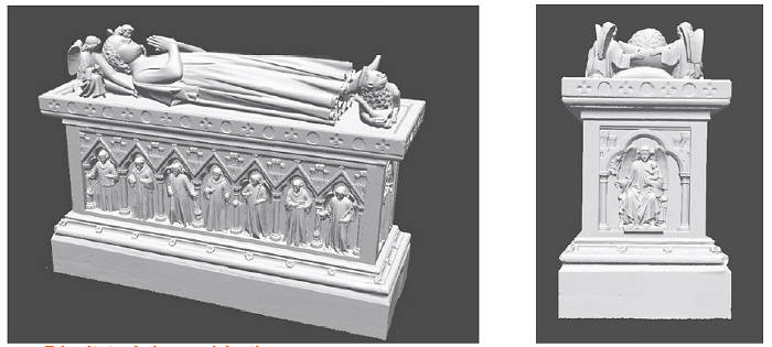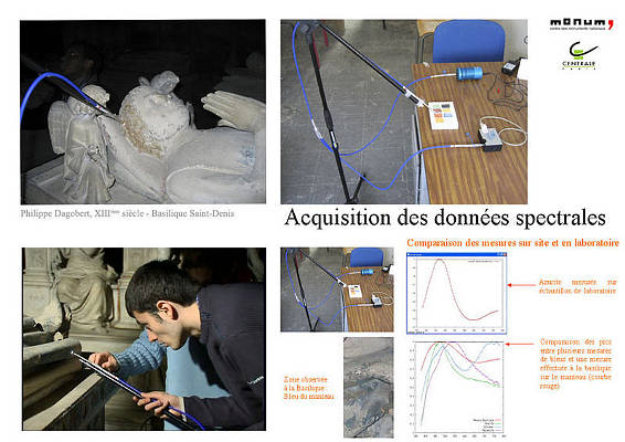 Nous présentons les derniers résultats d'une étude pluridisciplinaire, en cours à l'École Centrale Paris, portant sur la numérisation 3D, la simulation et le prototypage rapide d'objets du patrimoine. Ce travail s'inscrit dans le cadre d'une collaboration entre le Centre des Monuments Nationaux et trois laboratoires, ainsi que le Centre de prototypage Rapide Européen d'Assistance, de Transfert et d'Expérimentation (CREATE) de l'École Centrale Paris. Nous étudions une statue médiévale polychrome : le gisant de Philippe Dagobert (XIII` siècle, jeune frère de Saint Louis), dans la basilique de Saint-Denis, nécropole royale. Nos recherches portent sur la représentation 3D d'objets du patrimoine, la simulation de leur apparence visuelle à partir des caractéristiques optiques et physico-chimiques de leurs matériaux constitutifs et l'élaboration de répliques par des méthodes de prototypage rapide . Nous utilisons tout au long de notre travail des techniques et procédés sans contact avec l'œuvre d'art. Après de nombreux travaux sur la représentation des métaux et alliages, nous abordons ici l'étude et la simulation des matériaux de la peinture et de la dorure pratiquées au Moyen Age. Ce travail sur les matériaux devrait se poursuivre en collaboration avec le Louvre et le LRMH (Laboratoire de Recherche des -Monuments Historiques) pour une étude des parties basses du tombeau dont les originaux se trouvent dans les réserves du Louvre. Le rôle de l'éclairage naturel médiéval complète aussi la simulation et permet d'imaginer et comprendre les œuvres étudiées en fonction de leur place et rôle historiques. Ariane Genty, Patrick Callet.