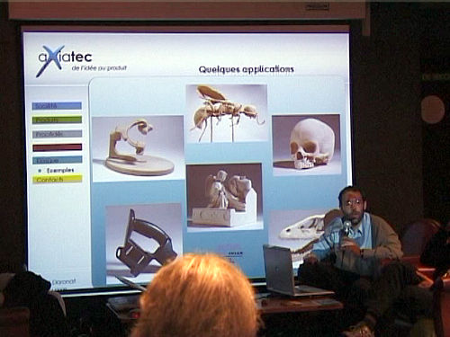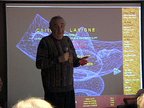 ![]() Présentation par Christian LAVIGNE ![]() Introduction philosophique par Simon DINER ![]() Conférence de C. LAVIGNE sur la création 3D ![]() Présentation par Michel DARONAT des techniques d'Impression 3D nouvelles mises au point par AXIATEC ![]() Jean-Luc SAVARINO, pionnier de l'animation 3D, présente ses derniers travaux ![]() Exemples de sculptures en Impression 3D couleur AXIATEC (l'image, prise sans flash, ne rend pas bien la vivacité des couleurs) Nos excuses pour les problèmes de son de la vidéo de cette rencontre.